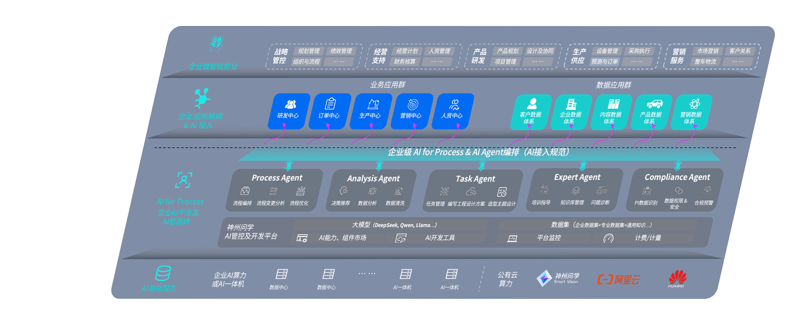 端到端的一站式AI工作空间深度融合了从企业战略规划到日常经营的全流程业务板块,,,,定向解决车企内部领域多、、、、部门多、、、链条长、、场景碎片化等难题,,支持车企快速构建以AI为核心的生产力写作体系,,实现任务执行与AI能力的无缝集成与交互