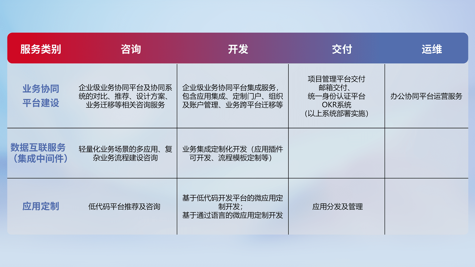 针对钉钉、、、、企微、、、、IDaas等平台级产品提供产品的规划、、、、方案、、交付、、、定制化开发等服务,,实现如统一协同办公、、、、智能客户服务、、、、混合会议管理、、、智能数据查询、、等业务场景,,,,实现数字化转型。。。。